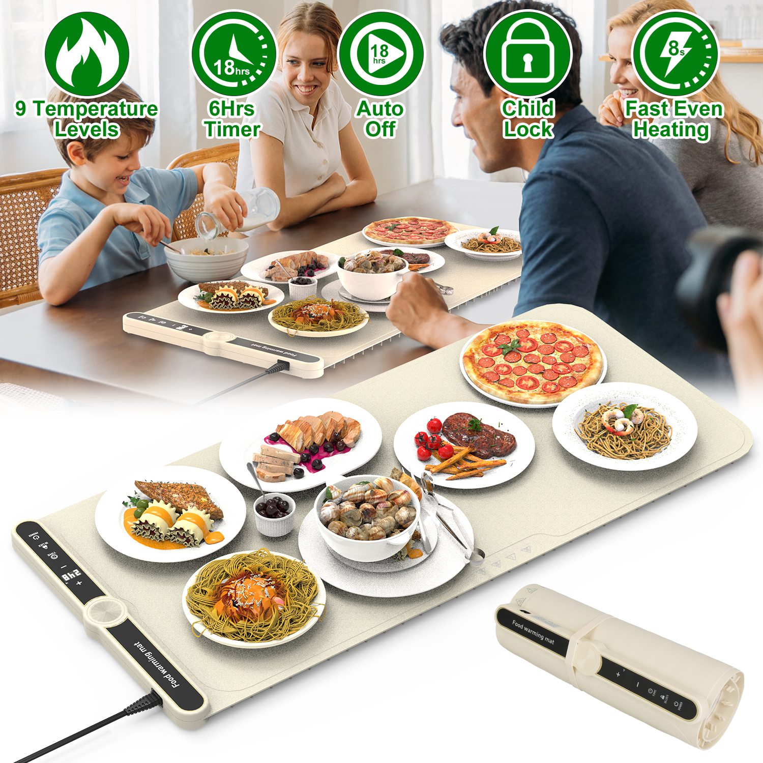 Whether it's family gatherings, festive celebrations, social dining, parties, buffets, or travel, this food warming mat is your ideal companion for keeping your dishes warm and ready to be savored. Advanced heating wires that cover the entire bottom enables quick and comprehensive heating. With 9 levels of temperature setting, you have full control over the heating level of your dishes. Smart timer function and auto-off protection keep you reassured when forgetting to turn off or unplug. Child lock protection ensures that your little ones stay safe around the warming mat. Suitable for a various types of tableware and widely used when it comes to facial masks, thawing, dough fermentation and dinner leftovers heating.