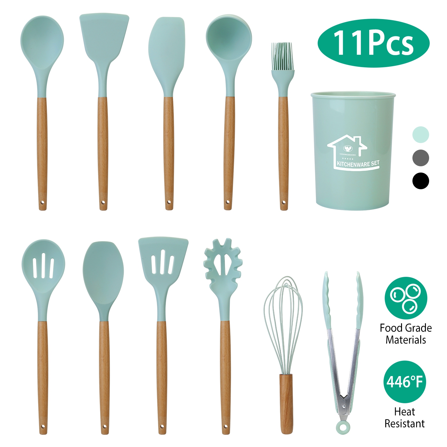 Home > 11Pcs Silicone Cooking Utensil Set Heat Resist Wooden Handle Silicone Spatula Turner Ladle Spaghetti Server Tongs Spoon Egg Whish Kitchenware Set w/ H