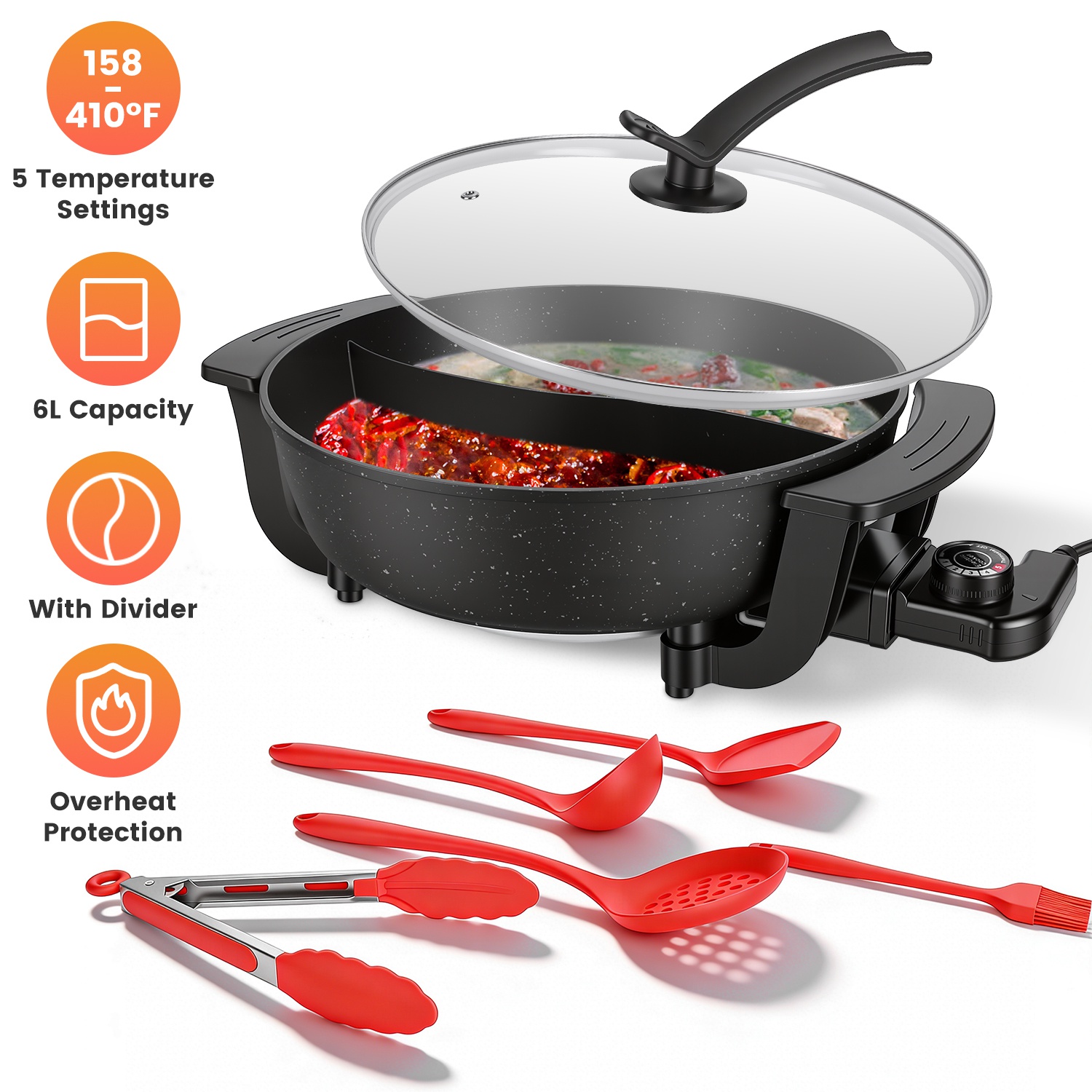 Ideal for 3-6 people, this 6L electric hot pot makes group dining effortless and fun. Cook two broths at once using the built-in divider to please every taste. With 5 precise temperature settings and a reliable non-stick coating, you can simmer, boil, or fry safely and clean up in a snap. Everything you need is included—ladle, tongs, spoons, and more. Bring friends and family together for delicious, customizable meals right at the table!
