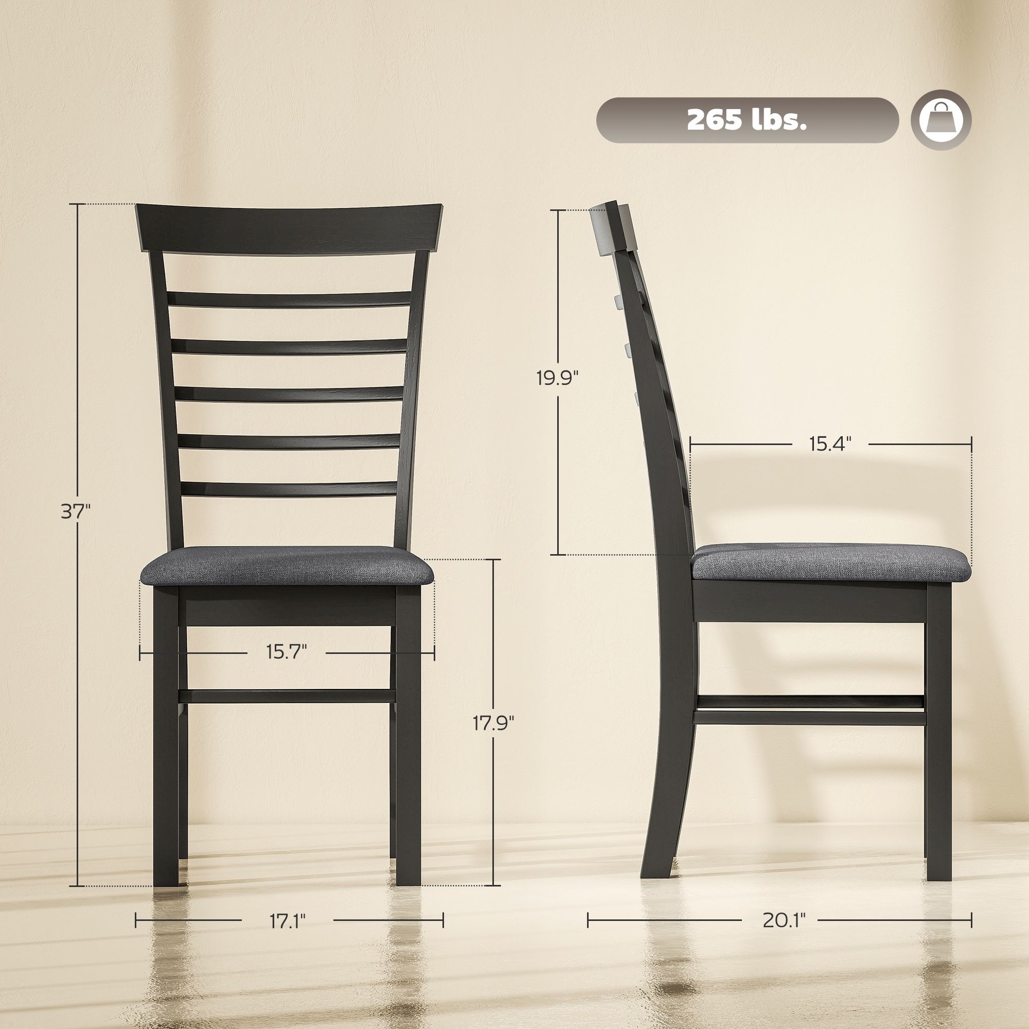 5.- Chairs for Dining Room Info: Overall dimensions: 17.1"" W x 20.1"" D x 37"" H. Seat dimensions: 15.7"" W x 15.4"" D x 17.9"" H. Weight capacity: 264 lbs. Assembly required.
